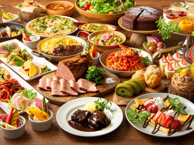 種類豊富な食事メニューに加え、デザートが自慢のビュッフェレストラン。自慢のデザートは、お客様の目の前で焼くクレープを中心に、シュークリーム、ケーキ、アイスクリーム、フルーツなど、見た目も楽しい様々な種類がずらりと並びます。食事メニューは、窯焼きのピザやパスタ、野菜をたっぷり摂れるサラダバーやデリ、肉料理や魚料理をバラエティ豊富にご用意しています。
