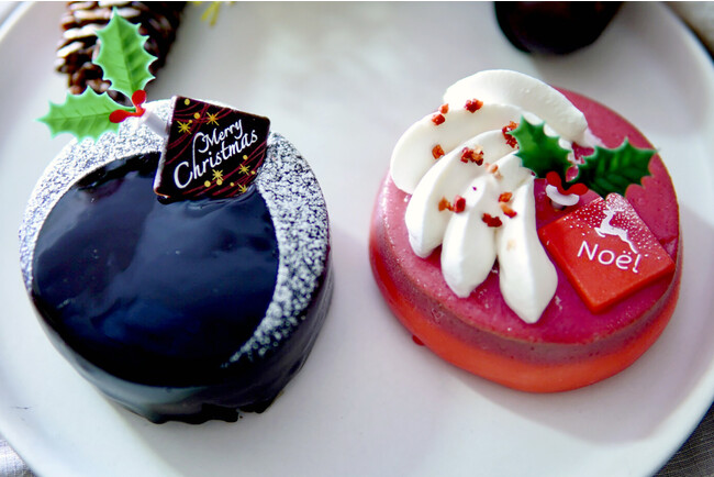 ザクザク触感のビスキュイに、濃厚なショコラクリームを合わせ星が輝く由比ガ浜をイメージした「ノエル星月夜」(写真左)と、全体をホワイトチョコとフランボワーズのグラッサージュでコーティングし静御前をイメージした「ノエル静」(写真右)のセット。