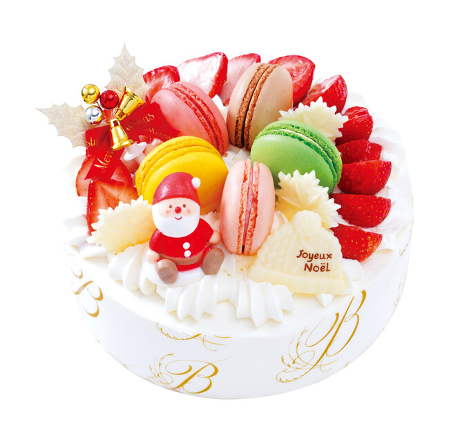 ソラマチ限定のオリジナルケーキ。人気のイチゴショートケーキの上にカラフルなマカロンを飾りました。