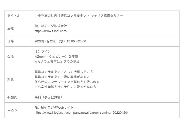 船井総研ロジ株式会社(本社:東京都千代田区、代表:菅重宏、以下「船井総研ロジ」)は、中小物流会社向け経営コンサルタントの業務内容をくわしく紹介するイベント「船井総研ロジ 中小物流会社向け経営コンサルタント キャリア採用セミナー』をオンラインで開催します。セミナーは、2022年4月20日(水)19:00〜20:00にオンラインで無料開催します。