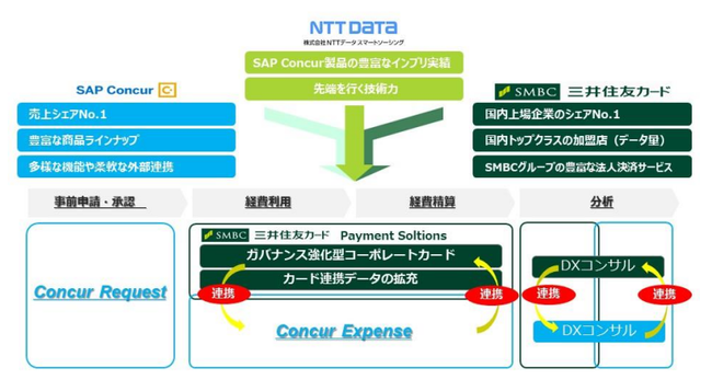 これまで、NTTデータ・スマートソーシングと三井住友カードは各社ごとにコンカーと連携し、「経費精算をなくす」に向け、SAP Concurの導入と法人向けクレジットカードの発行を通じたビジネスキャッシュレスを推進しておりました。この度、コンカーとの協業において、両社が培ってきた実績と強みを組み合わせ、日本企業のさらなるDX推進に向け全方位的な支援を可能とすべく、業務提携契約を締結しました。