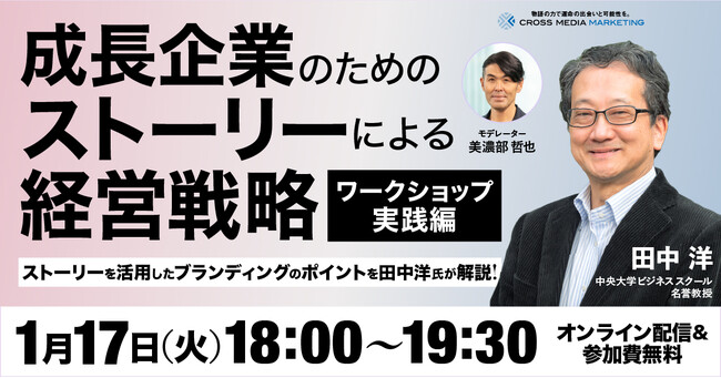 株式会社クロスメディア・マーケティングは、2023年1月17日(火)18時より「成長企業のためのストーリーによる経営戦略 【実践編】」を実施いたします。