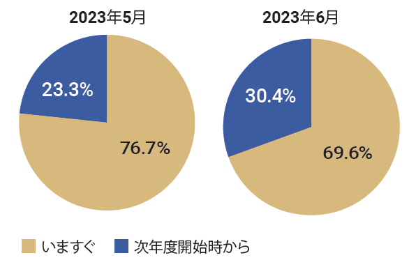 保育士バンク!の利用実績をもとに、当月の園の募集要件で、入職する タイミングが「いますぐ」なのか「次年度開始時」なのかの割合を算出、 前月と比較。