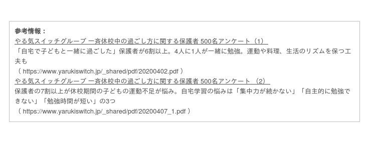 また、やる気スイッチグループが3月下旬に実施した「一斉休校中の過ごし方に関する保護者500名アンケート」の結果、一斉休校による困ったこと・悩みとして多かったのは、「運動不足(71.5%)」「生活リズムの崩れ(56.9%)」、「部活や習い事がなくなった(47.7%)」「自宅学習で集中力が続かない(45.4%)」、「学校で勉強できなくなった(44.8%)」、「楽しみにしていたイベントの中止(43.9%)」という結果でした。やる気スイッチグループではこのような悩みに応えるために、各教科はもとより運動や知育、英語など同社のスクールブランドのコンテンツを横断的に提供することで、生徒の学びをサポートしてまいります。