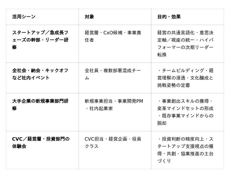 リリース後、スタートアップを中心に急速に拡大し、近年では パナソニック、NECなど大企業の事業開発部門・CVC領域でも導入が加速。経営視座の獲得・意思決定力育成・文化醸成に寄与しています。