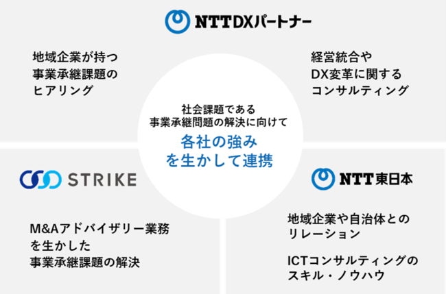 これらの課題に対してスピーディーかつ正確に解決へ導くために、地域企業のDXを用いた課題解決の経験・知見を持つNTT DXパートナーと事業承継コンサルの第一人者であるストライクが連携し、地域社会の課題解決へのさらなる貢献を目指します。