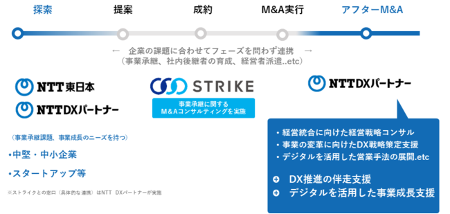 1. NTTDXパートナーから事業承継課題を持つ企業にストライクを紹介し、ストライクが事業承継に関するM&Aコンサルティングを行うことで、課題解決を図る。