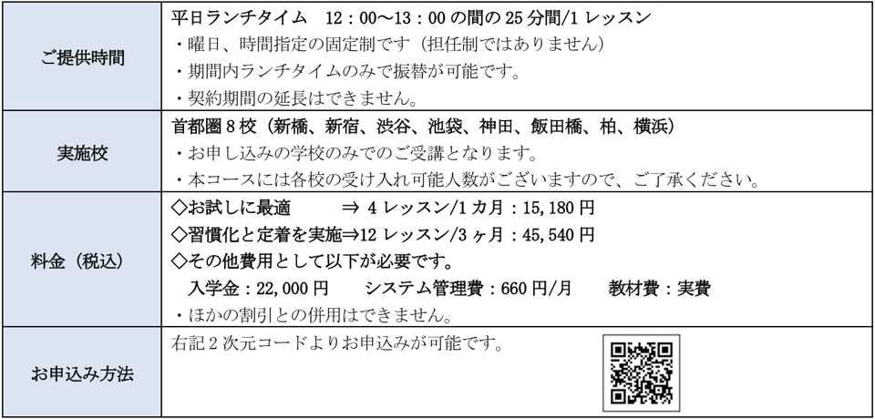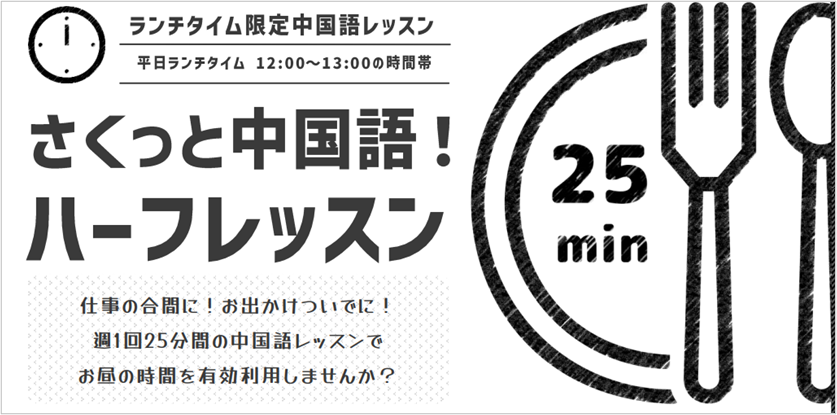 株式会社イーオン(本社:東京都新宿区、代表取締役社長:重野卓、以下「イーオン」)が運営するハオ中国語アカデミーは、首都圏8校にて通常50分間のレッスンを平日ランチタイム限定で25分間のハーフレッスンを提供いたします。