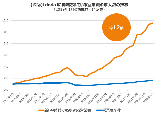 ■”新しい時代に求められる営業職”の求人数は、3年間で約12倍に増加