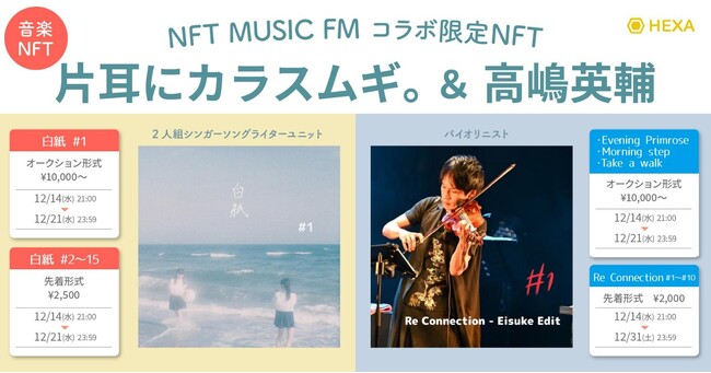 今回発売される「NFT MUSIC FM」と『片耳にカラスムギ。』『高嶋英輔』による限定コラボレーション音楽NFTはオリジナル1点物のNFTとなり、【片耳にカラスムギ。-音楽NFT】白紙は合計15個で、#1はオークション販売、#2〜#15は先着販売です。また、【高嶋英輔 from style-3!-音楽NFT】は合計で13個で、バイオリン一本で演奏した「Morning step」「Take a walk」「Evening Primrose」はオークション販売、DTMで作られた「Re Connection #1〜#10」は先着販売となります。「Morning step」「Take a walk」「Evening Primrose」は完全アドリブかつ一発録りしたコンテンツのため、この世に1点しかない作品です。