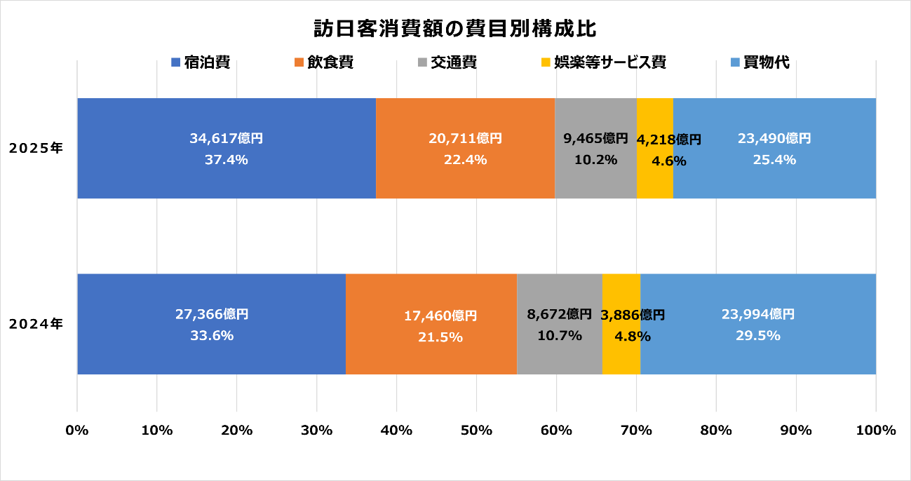 2024年と2025年の費目別構成比を比較すると、訪日客の支出の優先順位が変化していることが読み取れます。宿泊費・飲食費・交通費のサービス費用が全体の7割を占めており、買い物を中心としたものから、「宿泊や飲食といった滞在・体験型」へと明確にシフトしていると考えられます。