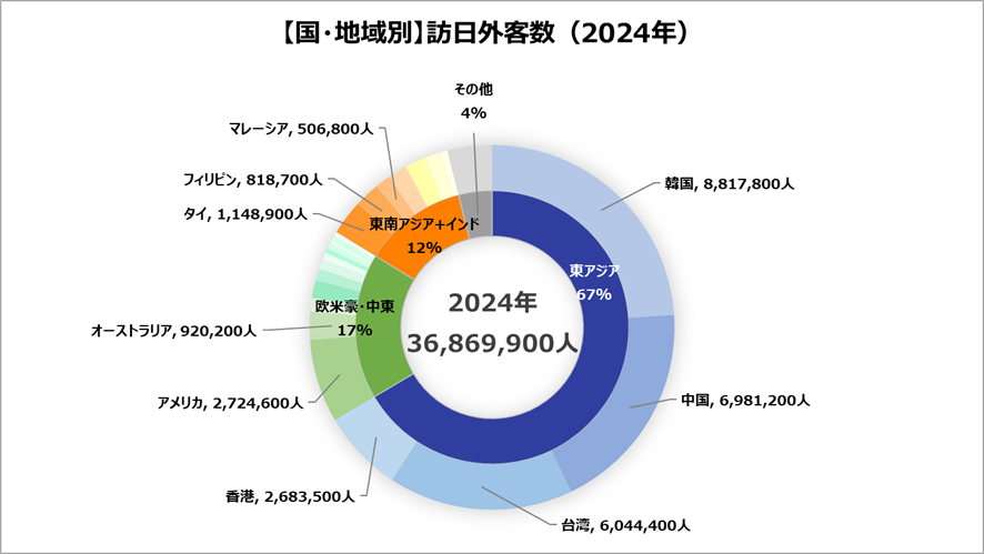 国・地域別では、1位が韓国945万人(2024年対比+64万人、+7.3%)、2位が中国909万人(2024年対比+211万人、+30.3%)、3位が台湾676万人(2024年対比+71万人、+11.9%)となりました。