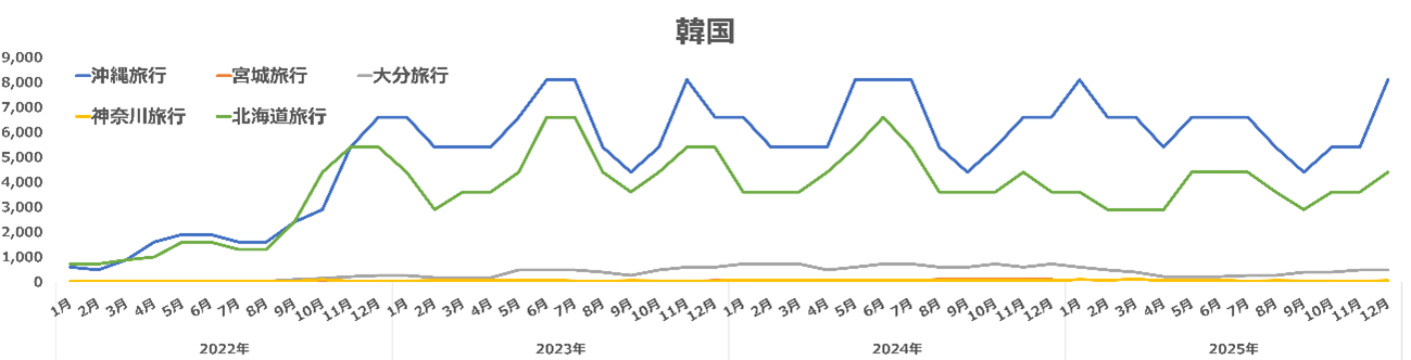 以下は、調査した8ヶ国・地域*の「沖縄旅行」、「宮城旅行」、「大分旅行」、「神奈川旅行」、「北海道旅行」の検索数の合計値をまとめたものです。これら5県は、2025年10〜11月の都道府県別宿泊者数トップ20において、2024年と比較して東京・大阪・京都など主要都市となる観光地以外で宿泊者数が多かった県です。オーバーツーリズムを避け、日本の「地方ならでは」の魅力を求める観光客が増えたと考えられます。