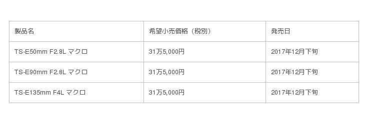 キヤノンは、レンズ交換式カメラEOSシリーズ用の交換レンズであるEFレンズシリーズの新製品として、アオリ(※1)撮影が可能なTS-Eレンズ3機種を2017年12月下旬より発売します。