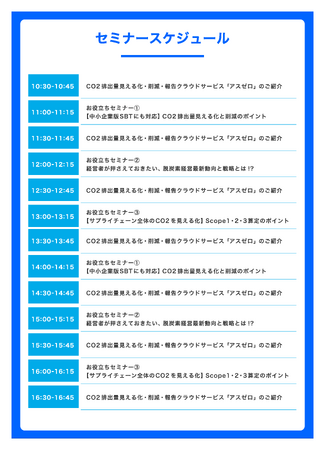 本展示会のブースではミニセミナーを行い、脱炭素経営最新動向/戦略、Scope1-3の算出ポイントやCO2見える化ソリューションがカンタンに学べる、脱炭素経営のヒントとなりうる情報をご紹介します。