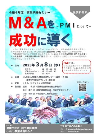 2023年3月8日(水)には事業承継セミナーを開催。今回は、事業承継方法の一つ、M&A(合併・買収)が成立後、重要となる統合作業(PMI)がテーマです。