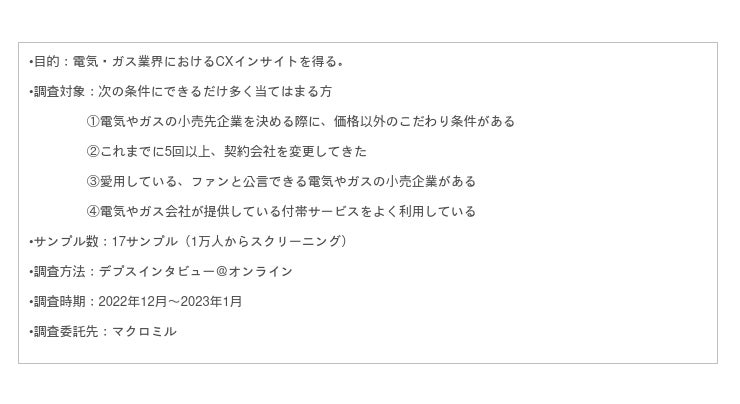 ユーザーが、電気・ガスの小売企業の契約・継続を、価格だけでなく付帯サービスも含めた顧客体験価値により判断する場合、企業が他社との差別化を図ることができるのでは、との仮説から、このたび非価格選好であるユーザーに対してデプスインタビューを実施し、そこから見出したCXインサイトを分析しました。