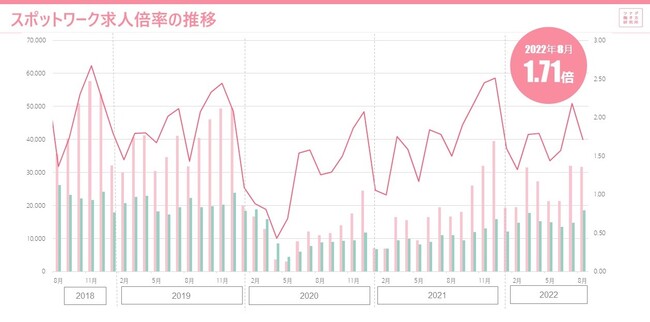 1.単発、短時間、短期間で働くスポットワークの2022年8月度求人倍率は1.71倍