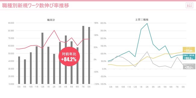 2.新規ワーク数は、対前年比で+84.2%。主要職種ではコンビニスタッフが+111.9%と伸長