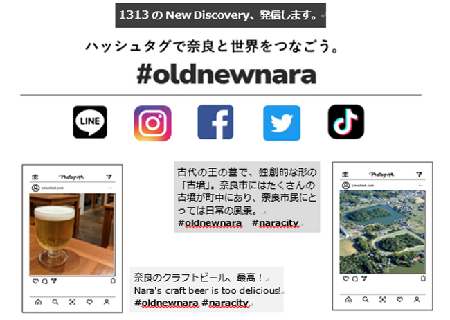 スローガンと連動した奈良市独自のハッシュタグとして、「#oldnewnara」を設定。旅行者や地元のみなさんが見つけた「New Discovery」がSNS上のハッシュタグで結びつき、世界中、誰でもいつでも、「奈良の新発見」にアクセスすることができます。710年に都が平城京に遷都して今年で1313年にちなみ、1313件の新発見を集めることを目標とします。