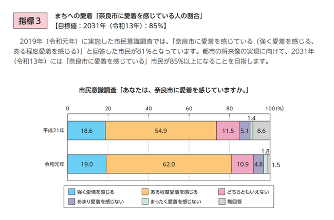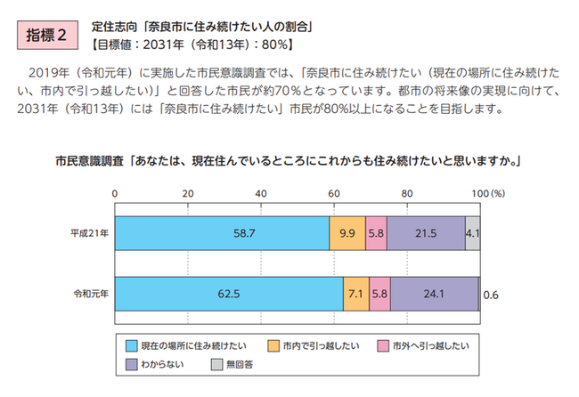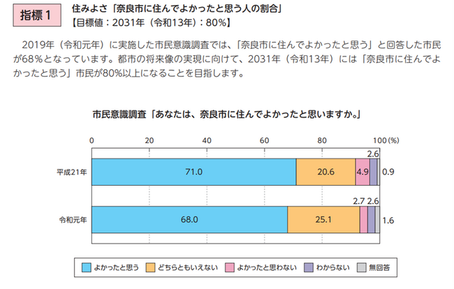参考:奈良市が策定した「第5次総合計画」では10年後に向けた5つの指標(住みよさ、定住志向、まちへの愛着、まちづくりへの関心、まちづくりへの参加)を数値目標として設定しています。下記に示したいずれの指標も8割以上の達成を目標としており、継続的な取り組みが求められています。