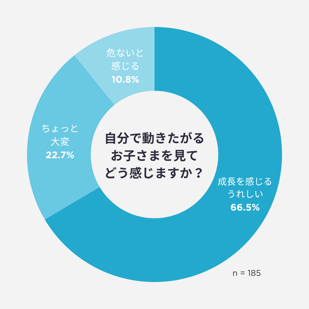 今回の調査で「ベビーカーを卒業した時期」を尋ねたところ、「3歳ごろ」(33.3%)が最多で、「4歳ごろ」(32.5%)、「2歳ごろ」(24.4%)が続く結果となりました。卒業理由は「子どもが自分で歩きたいと言い出したから」(62.9%)が多数。多くのベビーカーの対象年齢が4歳ごろまで設定されているものの、お子さまの成長に合わせて、2〜3歳といった比較的早い段階で卒業している家庭が多数存在することがわかります。このことからも、ベビーカー卒業は単に“使わなくなる時期”ではなく、「子どもが自分で歩きたいと言い出した」といった成長を喜び、応援する瞬間であることが浮き彫りになりました。[画像2: https://prcdn.freetls.fastly.net/release_image/37140/232/37140-232-8aa9a5550d2f5aa627719743351283d0-1080x1080.png?width=536&quality=85%2C75&format=jpeg&auto=webp&fit=bounds&bg-color=fff ]