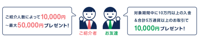 すでに『外貨ネクストネオ』を開設しているお客様(「ご紹介者様」)が、『外貨ネクストネオ』に興味をお持ちの方(「お友達」)を紹介していただき、後日その「お友達」が条件(『外貨ネクストネオ』にて10万円以上の入金(※1)および、合計5万通貨(※2)以上の新規取引)を満たされた場合には、「ご紹介者様」と「お友達」の双方にもれなく現金10,000円をプレゼントいたします。