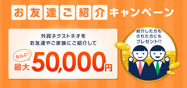 株式会社外為どっとコム(本社:東京都港区、代表取締役社長:竹内 淳)は、店頭FX『外貨ネクストネオ』にて、「お友達ご紹介キャンペーン」を2022年2月1日(火)より実施します。