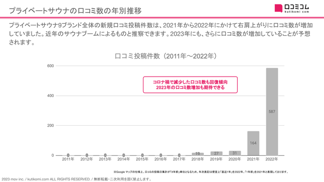 ・近年のサウナブームにより、2021年から2022年にかけて右肩上がりに口コミ数が増加し、2023年も更なる増加が予想されるため、口コミ対策が重要であること