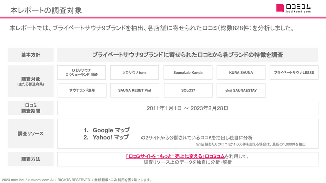 レポートをくわしく見る(無料) → https://academy.kutikomi.com/whitepapers/202303_privatesauna/?utm_source=pressrelease&utm_medium=prtimes&utm_campaign=202303_privatesauna ■ 本レポートの調査対象