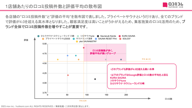 ・ブランド全体のGoogle評価の平均が約4.6と高い水準であり、プライベートサウナとして十分な付加価値が提供できていること