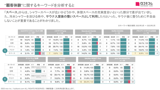 」を2枠以上できるようにしてほしいなどの声があがりました。熱心なサウナーの声を汲み取ることで、より良い口コミが集まり、集客につながるかもしれません。 レポートでは、他の8ブランドについても同様に分析しております。ダウンロードして、是非ご覧ください。 → https://academy.kutikomi.com/whitepapers/202303_privatesauna/?utm_source=pressrelease&utm_medium=prtimes&utm_campaign=202303_privatesauna ■ 各ブランドを共通キーワードで比較してみると...