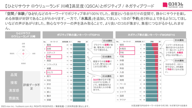 レポートをくわしく見る(無料) → https://academy.kutikomi.com/whitepapers/202303_privatesauna/?utm_source=pressrelease&utm_medium=prtimes&utm_campaign=202303_privatesauna ■ ひとりサウナ ロウリューランド 川崎の口コミで多用されるワードを分析してみると...