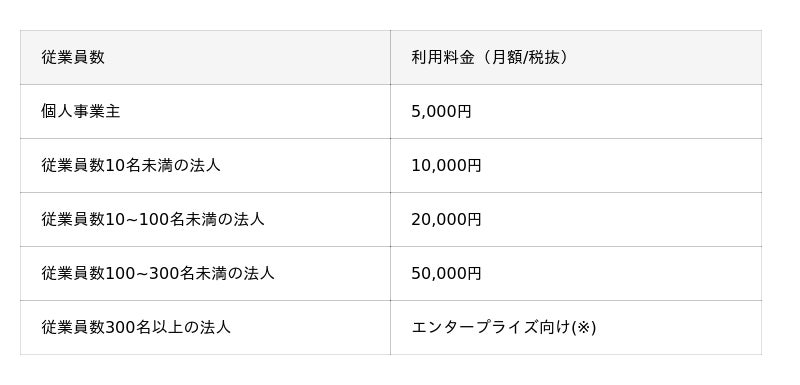 『Legal Base』は規模に応じて月額5,000円(税抜)から、従業員の人数に応じて4つの機能を無制限に利用可能です。