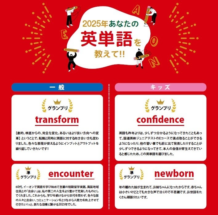 英会話教室を運営する株式会社イーオン(本社:東京都新宿区、代表取締役社長:重野卓、以下「イーオン」)は、イーオン、イーオンキッズにお通いの生徒様を対象に、2025年10月14日〜11月30日の期間中、様々なエピソードとともに2025年を象徴する英単語を募集しました。英単語を選んだ理由では応募者の皆様の様々な想いを綴ってくださいました。その中からイーオンの教師をトレーニングする教務トレーナーが、一般(高校生以上)部門、キッズ部門それぞれにおいてグランプリ・準グランプリを決定しました。