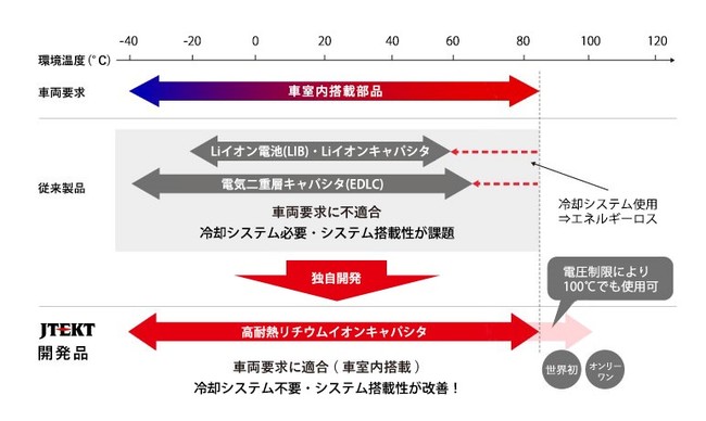 これからもジェイテクトの高耐熱リチウムイオンキャパシタは、自動車業界のみならず、工作機械、建設機械、鉄道、発電装置、交通インフラなど様々な領域での拡販を進め、その用途も補助電源、予備電源、発電装置の機能安定化、電源回生、さらにはメイン電源としてお客様のニーズに合った様々な形で貢献してまいります。