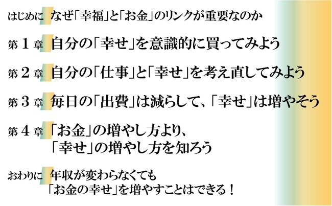 従来のお金の本は、増やすことや削ることばかりをテーマとしてきましたが、そこにある「本人の喜び」や「幸福度」はおざなりにされてきました。本書では、人生の「満足感」を上げるヒントを紹介します。