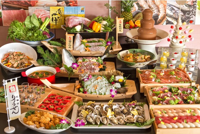 冬の味覚『牡蠣』や『寒ヒラメ』、地元の食材や瀬戸内海の海の幸として『ハマチ』、『ひまわり牛』などの冬の香川をグルメにお愉しみ頂けるメニューが満載です。人気のお刺身コーナーでは、瀬戸内産「寒ヒラメの薄造り」、「県魚ハマチのお造り」や「真鯛のお造り」など、新鮮なお魚が楽しめます。ライブキッチでは揚げたてのカキフライや海鮮握り鮨、地元白方漁港直送の牡蠣を使った「蒸し牡蠣」も登場します