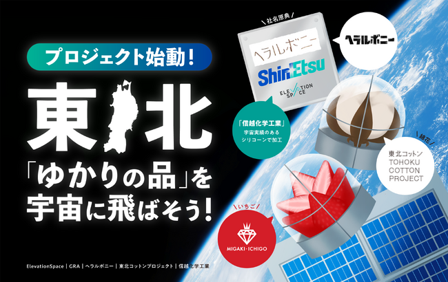 本プロジェクトは、ElevationSpace が2021年に実施したクラウドファンディング「名産品を載せて、東北の民間企業初となる人工衛星を飛ばしたい!」の目標額達成を受け実施するもので、2025年に打ち上げる人工衛星「あおば」に、東北”ゆかりの品”である「ヘラルボニーの社名原典」「ミガキイチゴ」「綿花」の3品を搭載します。