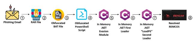 最後のペイロードRemcos - スイスアーミーナイフのようなRAT:Remcosマルウェアのメモリへのロードに成功すれば、攻撃は完了です。強力なRATであるRemcosによって、攻撃者は侵害されたシステムを完全にコントロールできるようになります。Remcosは攻撃者にとってスイスアーミーナイフのような万能の武器となり、不正アクセス、データ流出、キーロギング、遠隔監視など、幅広い悪意あるアクティビティの実行を可能にします。