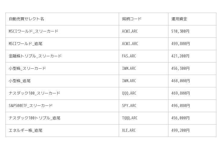 ETF自動売買セレクトの運用に必要な資金目安は下記のとおりです。(一部の銘柄紹介です)