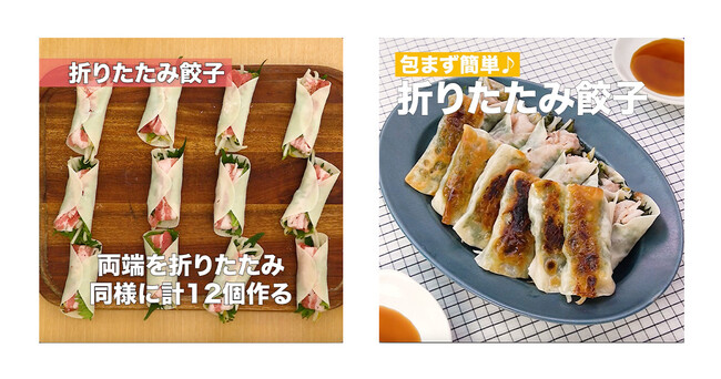 5位は「折りたたみ餃子」。 『DELISH KITCHEN』で人気のレシピは「包まず簡単♪ 折りたたみ餃子」で、特に40代〜50代のお子様のいるご家庭の女性から人気を集めています。名前の通り餃子の皮を「折りたたむ」ので、1つ1つヒダを作る通常の餃子より簡単に包むことができます。また、「ひき肉」ではなく「豚バラ肉」を使用するため、餃子の中の餡を作る必要もなし!具材を皮に乗せて折りたたむだけという2重の手軽さがポイントです。第1位・第2位と同様にSNSでも人気で、上記の簡単さに加え、具材がテンポ良く包まれていく様子が目を引く動画になっています。