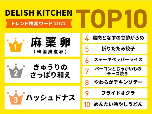『DELISH KITCHEN』、2022年のトレンド検索ワードTOP10を発表!SNSのトレンドが大きく反映され、「麻薬卵(韓国風煮卵)」が圧倒的No.1に。2023年のトレンドは?