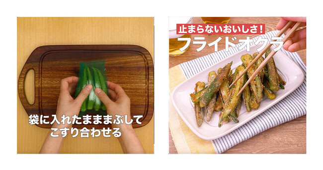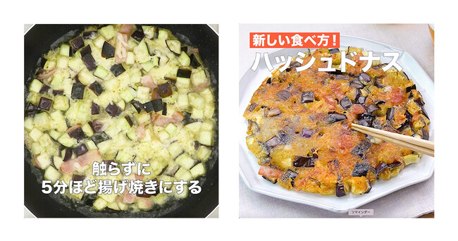 また、3位「ハッシュドナス」と9位の「フライドオクラ」は野菜の新たな食べ方として注目が集まり、SNS上でトレンドとなりました。どちらも30代〜50代のお子様のいるご家庭の女性からの人気が高いことから、「サクサクとおやつ感覚で野菜を食べることができる」という点にニーズがあるのかもしれません。「ハッシュドナス」で人気のレシピ「新しい食べ方! ハッシュドナス」は、具材を切ってまとめ、チーズと一緒にフライパンで揚げ焼くだけの簡単レシピ。「ナスといえば和風の味付け」という定番を覆すレシピです。