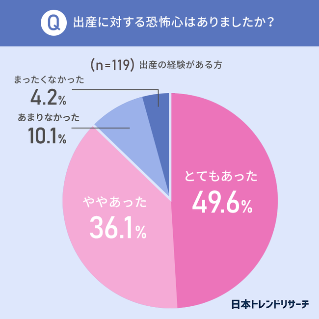 「とてもあった」が49.6%、「ややあった」が36.1%と、合わせて85.7%の方が出産に対する恐怖心があったと回答しました。