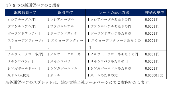 今回追加する通貨ペアの中には高金利通貨の特徴を持つ通貨ペアもあり、よりお客さまの投資スタンスに合わせた多様な取引が可能となり、一層の取引機会と利便性をご提供できるものと考えております。