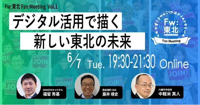 今年度のFw:東北Fan Meetingの初回として、6月7日(火)19:30より「東北デジタル創生塾 Vol.1 デジタル活用で描く新しい東北の未来」を、下記要領にて開催します。