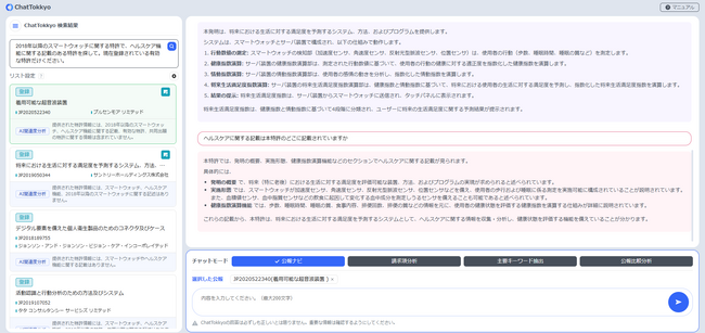 たとえば、「2018年以降のスマートウォッチに関する特許で、ヘルスケア機能に関する記載のあるもののうち現在登録されている有効な特許だけを探して。」などと質問すると、答えが即座に返される。