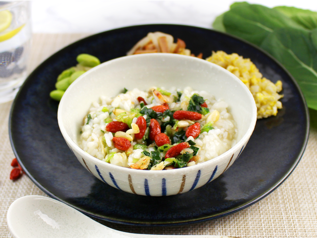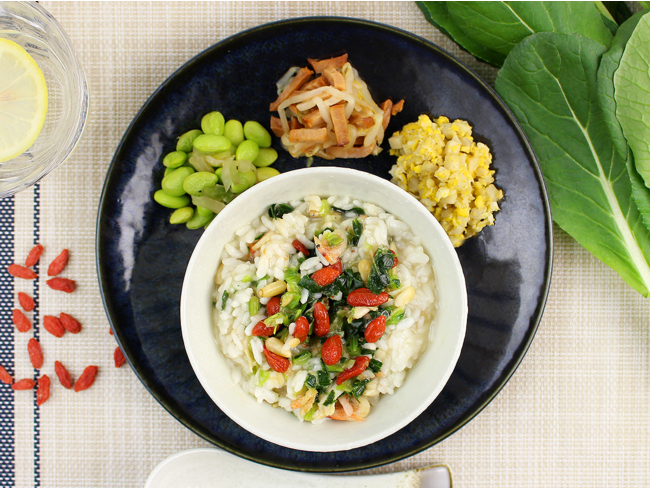 マンナンライスをブレンドしたお米に鶏と野菜のおだしで仕上げた中華粥をご用意いたしました。具材には、鶏ささみ、桜エビ、小松菜を使用し、食感の違いが楽しめるクコの実と松の実を散らしております。お粥とよく混ぜてお召し上がりください。