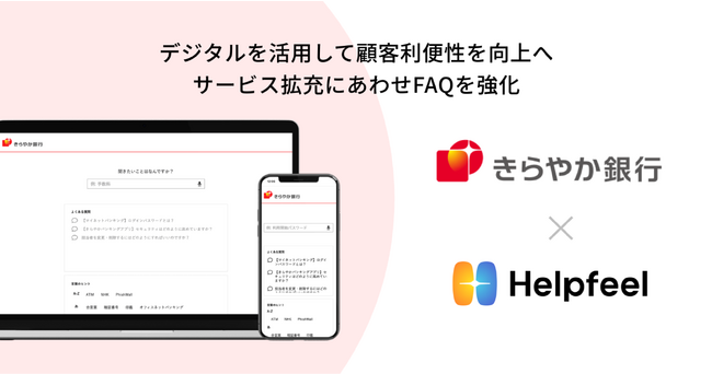 株式会社Helpfeel(京都府京都市 代表取締役/CEO:洛西 一周 以下、Helpfeel)は、株式会社きらやか銀行(山形県山形市 代表取締役頭取:川越 浩司 以下、きらやか銀行)が、きらやか銀行のホームページに検索型FAQ「Helpfeel(ヘルプフィール)」(https://helpfeel.com/)を導入いただいたことをお知らせいたします。